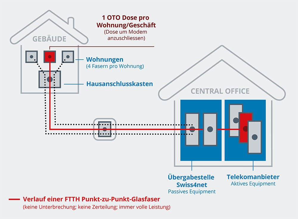 Das Glasfasernetz ist vollständig ausgebaut und bietet eine zukunftssichere Infrastruktur für Wohn- und Geschäftsliegenschaften. Jede Wohn- oder Geschäftseinheit verfügt über genügend Glasfasern, die direkt von der Zentrale bis zur optischen Telekommunikationsdose (OTO-Dose) geführt und aufgeschaltet sind. Dadurch erhält jede Einheit eine eigene direkte Verbindung, ohne Bandbreitenteilung oder Leistungsverlust – unabhängig von der Nutzung durch andere Parteien.